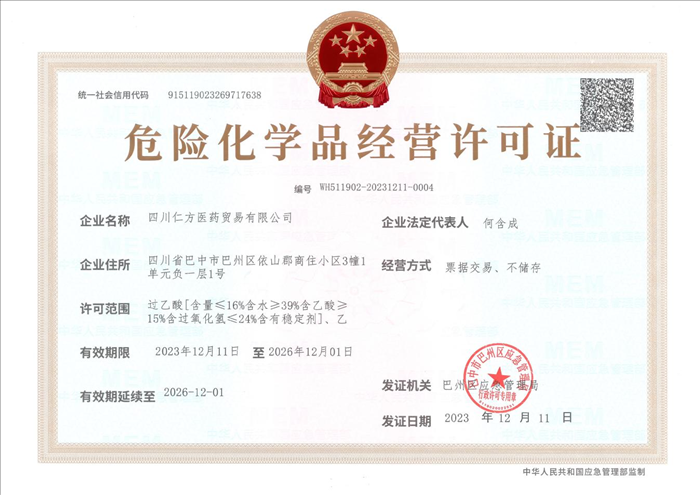近日,巴中市道地藥業(yè)有限公司全資子公司四川仁方醫(yī)藥貿(mào)易有限公司(以下簡稱“仁方醫(yī)藥公司”)成功申獲由巴中市巴州區(qū)應急管理局簽發(fā)的《危險化學品經(jīng)營許可證》,經(jīng)營許可范圍?